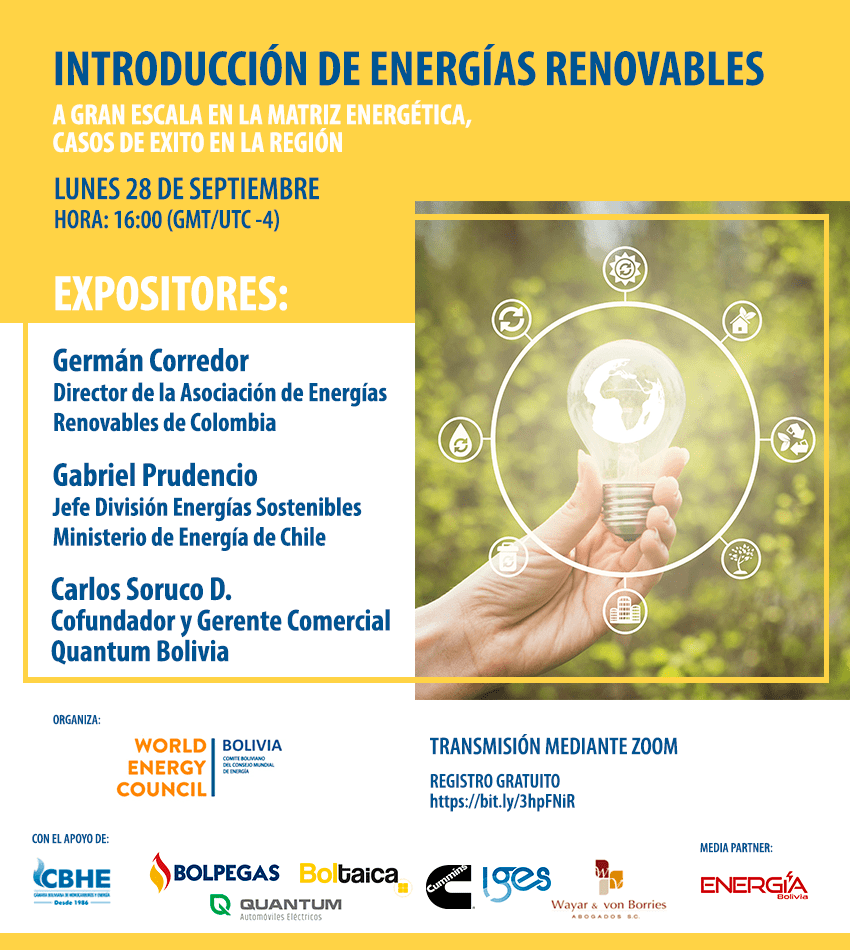Este lunes 28 de septiembre arranca el primer evento denominado “WEC Bolivia Online, introducción de las energías renovables”, a cargo del capítulo país, con el objetivo central de promover la provisión y el uso sostenible de la energía para obtener el mayor beneficio para todos.