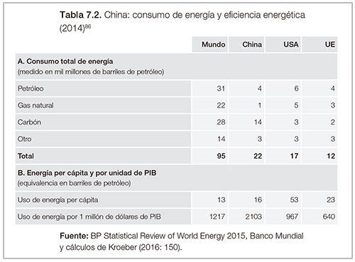 China es el principal consumidor de energía: es responsable de casi un cuarto del consumo global, dice Oswaldo Rosales en el libro el Sueño Chino, publicado este año por la CEPAL. Agrega que esto representa 30% más de energía que los Estados Unidos y prácticamente el doble de la Unión Europea, remarcando que también es el principal consumidor de carbón del mundo y, por ende, el mayor contribuyente a las emisiones de dióxido de carbono, causante central del calentamiento global.