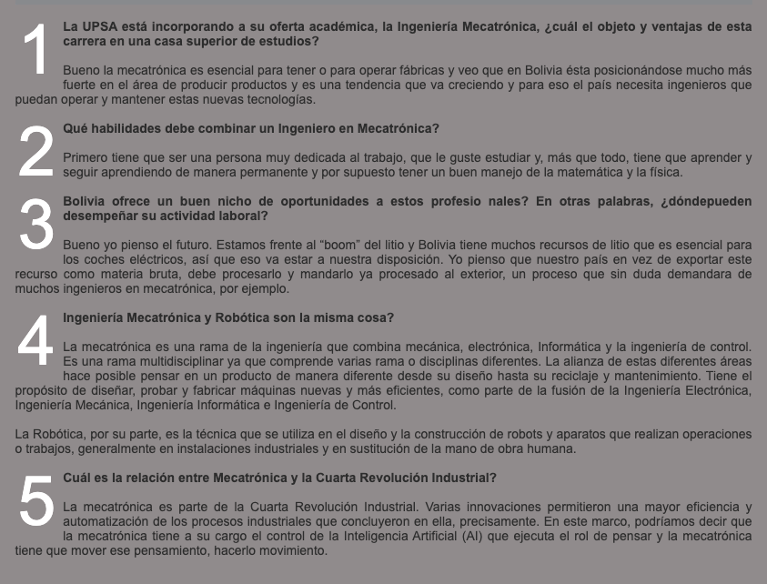 Beltrán, con trayectoria en Mecatrónica, fue director de Ingeniería en Estados Unidos y México del fabricante global de automóviles, motocicletas, robots, motores y autopartes, y acudió por invitación para realizar una presentación tipo conversatorio con Oscar Serrate Cuéllar, Decano de la Facultad de Ingeniería de la UPSA, compartiendo su experiencia y presentando un modelo de Mecatrónica y Robótica para aumentar el potencial del ser humano.