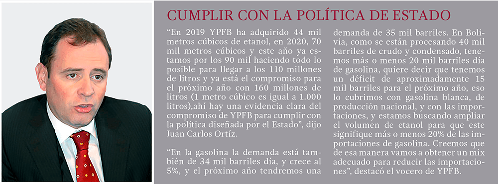 “El etanol es, en este caso, el sustituto de la gasolina. Alrededor del 20% de la gasolina importada será sustituida el próximo año, mientras que este año lo ha sido aproximadamente en un 15%, de manera que se puede ver ahí la voluntad de YPFB de ir sustituyendo paulatinamente las importaciones”, dijo.