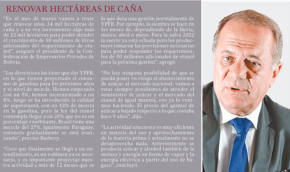 Barbery afirmó, que entre los agricultores y empresarios cañeros hay conciencia de la gran responsabilidad que significa la producción de caña de azúcar y de la producción del etanol para contribuir al cambio de matriz energética en el país, “acompañando a YPFB” en esa tarea urgente.