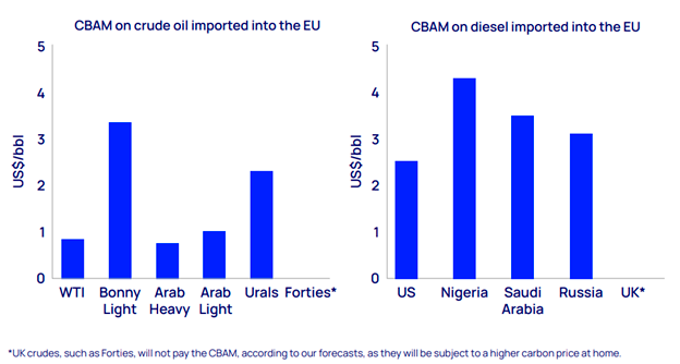 As with steel, consumers of oil and gas products in the EU will see prices rise as the CBAM takes hold. The report estimates that full CBAM implementation could boost crude and refined product prices by up to US$5/barrel, adding 30-euro cents per litre to costs at the pump.