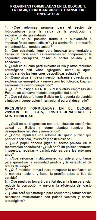 Los candidatos asistentes tuvieron la oportunidad de responder a 14 preguntas vinculadas al sector energético y económico que fueron enviadas previamente a los candidatos con el propósito de obtener respuestas consistentes y ofrecer a los asistentes y a la población; propuestas serias, consistentes y de valor para el conjunto del país, devastado por la improvisación.