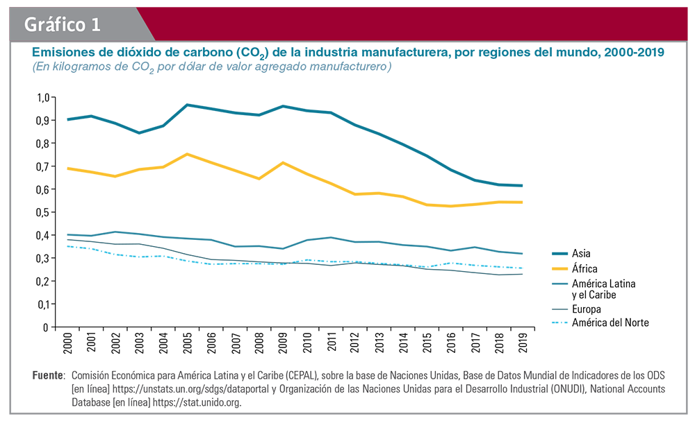 Asegura que otras regiones del mundo han mostrado avances más significativos; por ejemplo, remarca que a principios de la década de 2000, Asia tenía un nivel de emisiones por unidad de valor agregado manufacturero de 0,902 kg/ dólar, pero hace notar que en los últimos 20 años logró una mejora significativa y alcanzó los 0,615 kg/dólar en 2019.