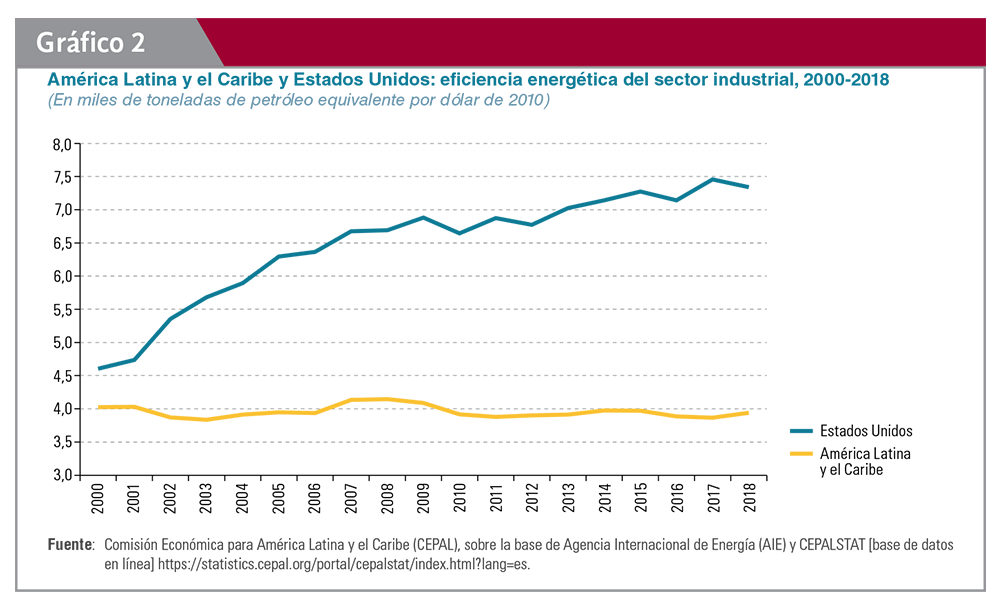 El documento de la CEPAL denominado “América Latina y el Caribe en la mitad del camino hacia 2030, avances y propuestas de aceleración”, indica que en la región la eficiencia energética del sector industrial, definida como el valor agregado que es posible generar con una unidad de energía, se ha mantenido prácticamente constante a lo largo de las últimas dos décadas.