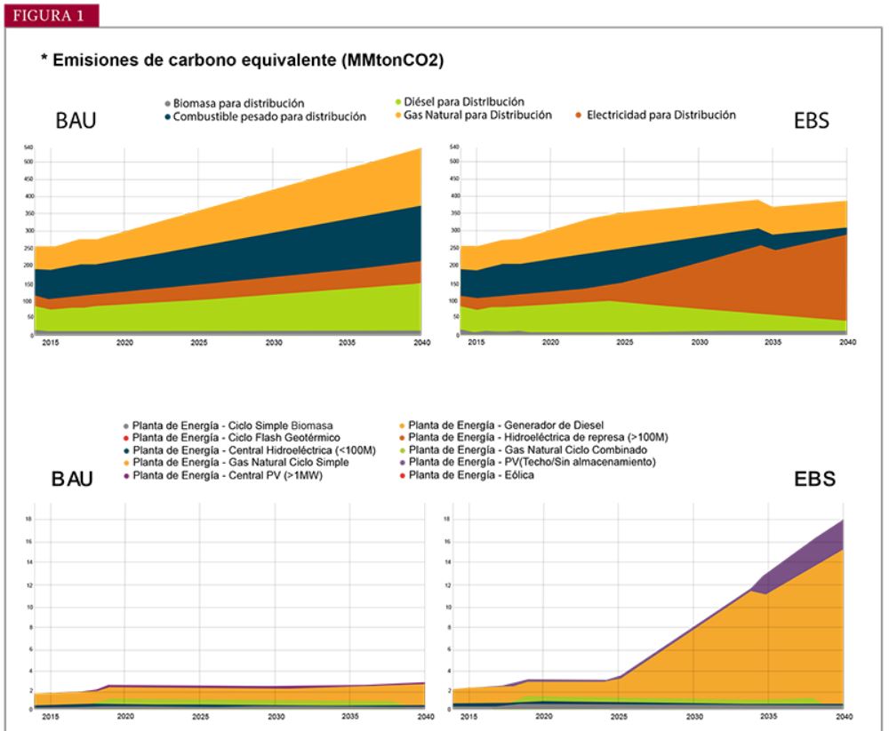 Explica que los resultados de la implementación de esta medida en el SEB también fueron simulados con el modelo, considerando la demanda energética total del sistema, la potencia instalada y las emisiones totales. Sus resultados se muestran en la Figura 1.