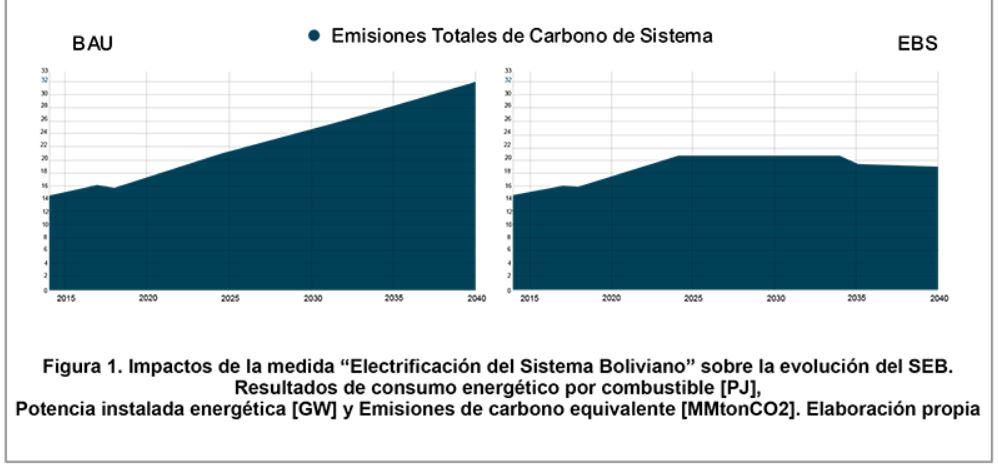 Considera que el impacto de esta electrificación paulatina permite estabilizar las emisiones de carbono en el tiempo a partir del año 2025 asegurando que esto, a su vez, permite entender que la reducción del consumo de combustibles debería ser equivalente al incremento drástico de la demanda eléctrica dependiente de centrales termoeléctricas de gas natural en Bolivia.