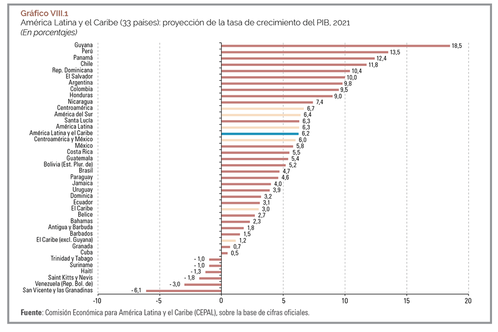 En este marco, la CEPAL proyecta un crecimiento del 6,2% para la región y espera que el crecimiento sea del 6,4% en América del Sur, del 6,0% en Centroamérica y México, y del 1,2% en el Caribe (sin incluir Guyana) (véase el gráfico VIII.1).
