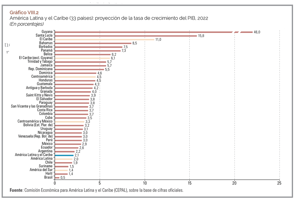 En relación a las perspectivas de crecimiento de la región para 2022 indica que han sido revisadas a la baja. Agrega que la CEPAL proyecta ahora una tasa de crecimiento del 2,1% para América Latina y el Caribe, precisando que América del Sur crecería un 1,4%, mientras que Centroamérica y México crecerían un 3,3%, y el Caribe (sin incluir Guyana) crecería un 6,1% (véase el gráfico VIII.2).