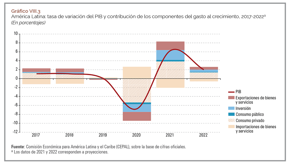 Desde el punto de vista de la composición de la demanda agregada, la recuperación proyectada descansará principalmente sobre el componente interno, dado que se prevé que el aporte del sector externo al crecimiento del PIB no sea significativo (véase el gráfico VIII.3).