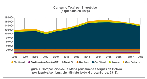 En la Figura 1, explica que en miles de barriles equivalentes de petroleo (Kbep), extraída del último estudio de balances energéticos realizado a nivel nacional, representa el crecimiento que el sector tuvo en el periodo 2006-2018, dejando claramente al gas natural como el principal recurso energético del país al considerar exportaciones (casi el 80% de la oferta energética primaria total en el 2018). Acota que el petróleo y gasolinas ocuparían el segundo lugar, la biomasa el tercero y el resto de energías renovables el cuarto lugar de relevancia, en términos de cantidad.
