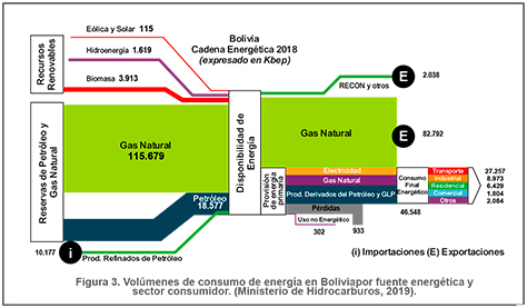En este marco refiere que el Balance Energético de Bolivia se muestra en un diagrama de Sankey (Figura 3) que expresa los volúmenes de energéticos utilizados en las diferentes etapa del balance energético, hasta llegar a agrupar los consumos por sectores económicos a nivel nacional.